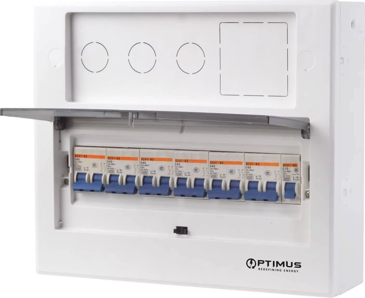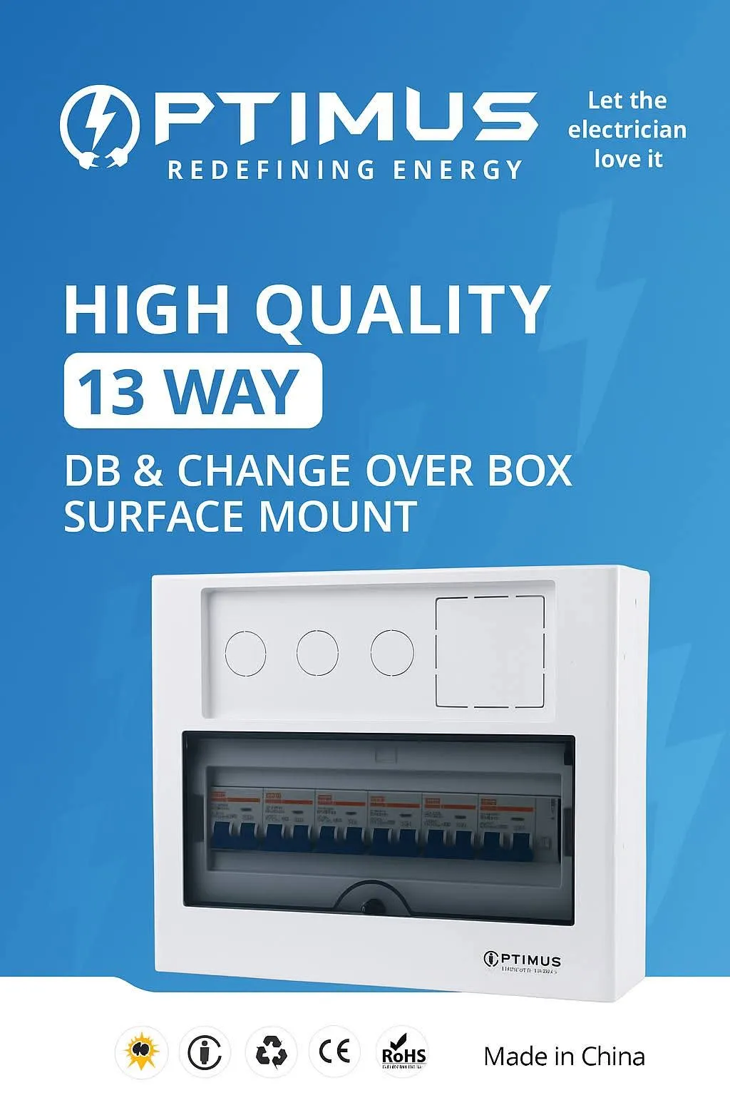 The OPTIMUS 13-Way Distribution Board & Change Over Box is a high-quality, surface-mounted unit designed for durability, safety, and ease of installation. Featuring a robust metal back enclosure for enhanced strength and heat resistance, paired with a sleek, high-grade plastic front cover, it combines reliability with modern aesthetics. Ideal for residential, commercial, and light industrial applications, this unit ensures efficient power distribution and smooth changeover functionality. Certified to CE and RoHS standards, the OPTIMUS DB & Change Over Box is built to meet professional electrical requirements while being easy to install and maintain—truly living up to the motto, “Let the electrician love it.” Made in China with OPTIMUS quality assurance.